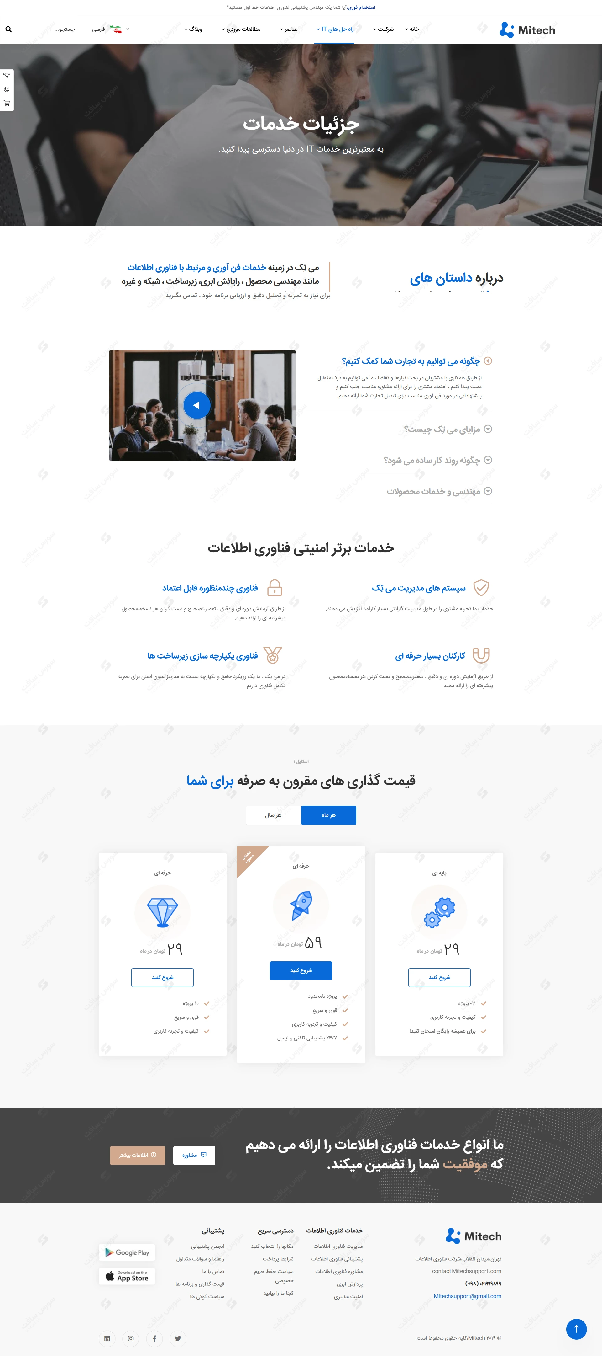 وجود صفحات آماده در قالب Mitech فقط یک لیست تبلیغاتی نیست. هر صفحه برای یک سناریوی واقعی طراحی شده است . مثلاً صفحه خدمات به گونهای چیده شده که بتوانید هر سرویس را با توضیح مشکل راهکار و نتیجه معرفی کنید.